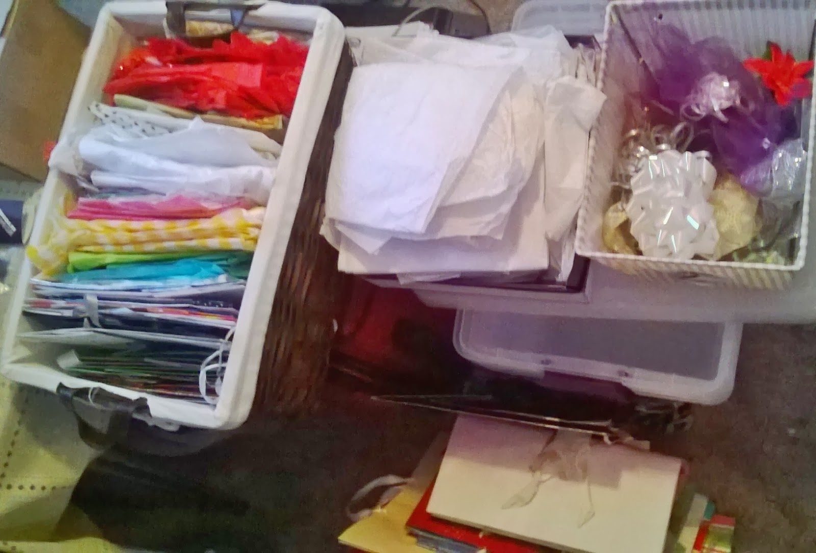 Writing and sewing are rather on hold as I am still working to make our apartment livable! Today I finally got around to sorting through five bags/boxes of tissue paper and other wrapping supplies we'd saved from our showers, wedding and Christmas. I think we'll be set for awhile, don't you?